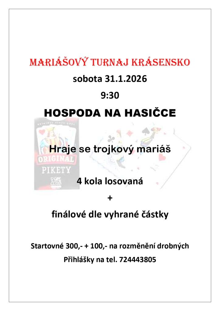 Mariášový turnaj se uskuteční na hasičce. Všichni milovníci této karetní hry jsou zváni k účasti. Přijďte si užít příjemné den plné soutěžení a zábavy.